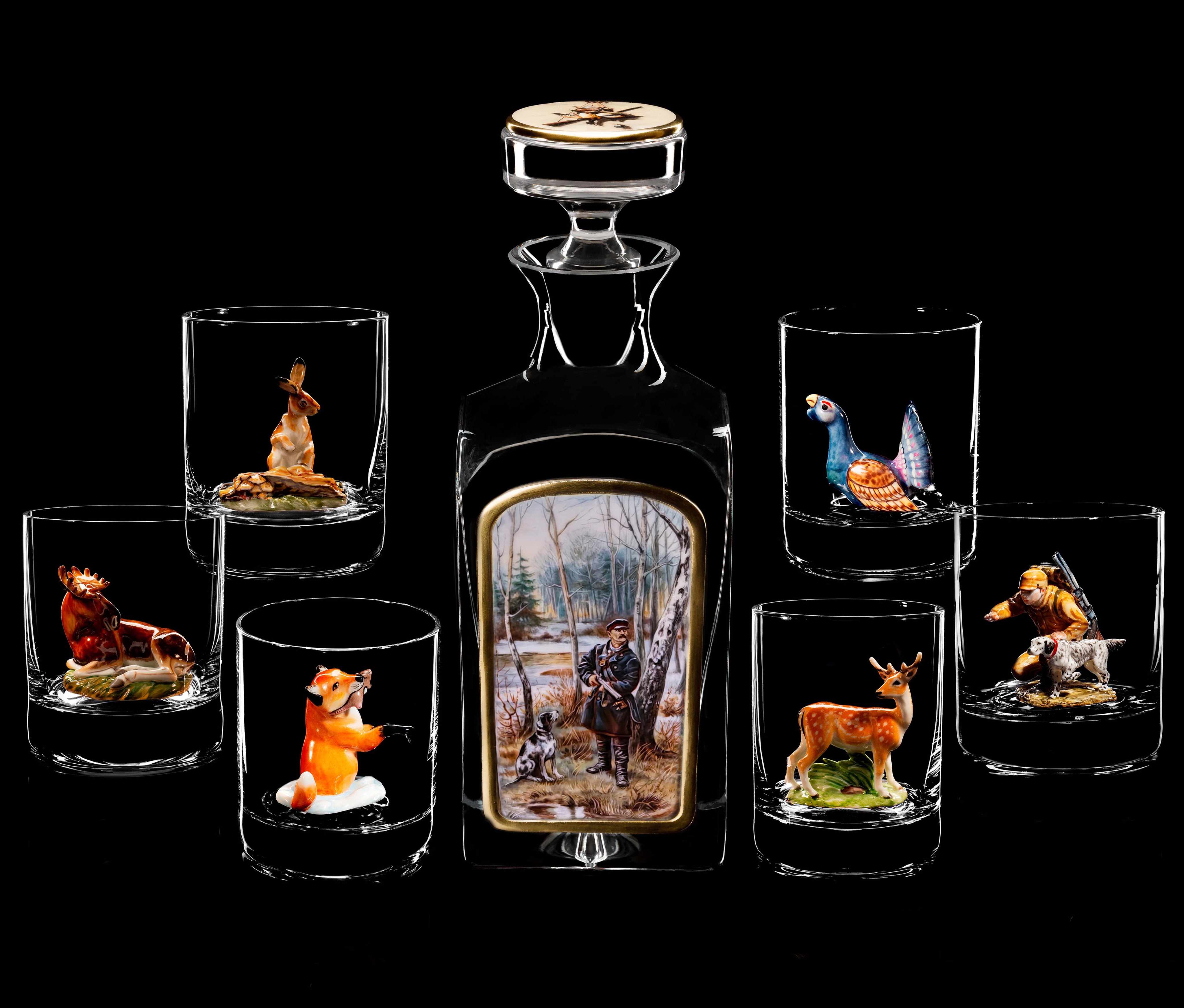 Подарочный набор "Русская Охота Штоф" - это настоящий шедевр и грандиозный ВИП-подарок. Набор состоит из шести бокалов для виски с разнообразными животными, выполненными из тончащего фарфора, и прекрасного штофа с фарфоровой пластиной. Фигурки и пластина слеплены и расписаны вручную художниками нашей мастерской. В набор "Русская Охота Штоф" могут входить разные фигурки на ваш выбор, например: Лиса, Лось, Глухарь, Заяц, Охотник, Лань и штоф с фарфоровой пластиной.